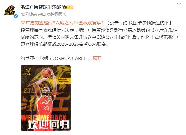 衛(wèi)冕冠軍廣廈官宣:續(xù)約總冠軍外援卡爾頓 新季助力沖2連冠